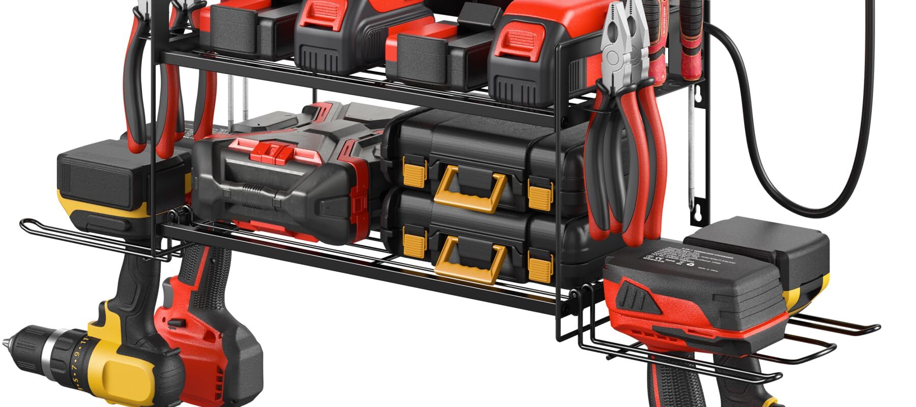 The CCCEI Garage Tools Storage is designed to organize power tools and batteries while providing a charging station for convenience.