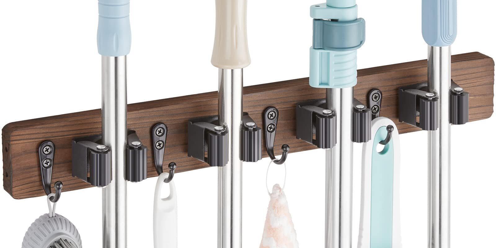 - Slots: 4 spring-loaded slots to hold brooms, mops, and similar tools securely